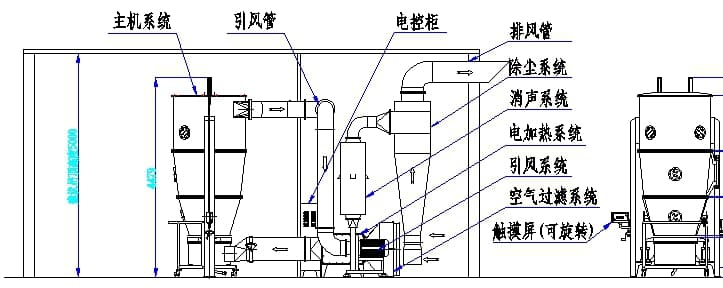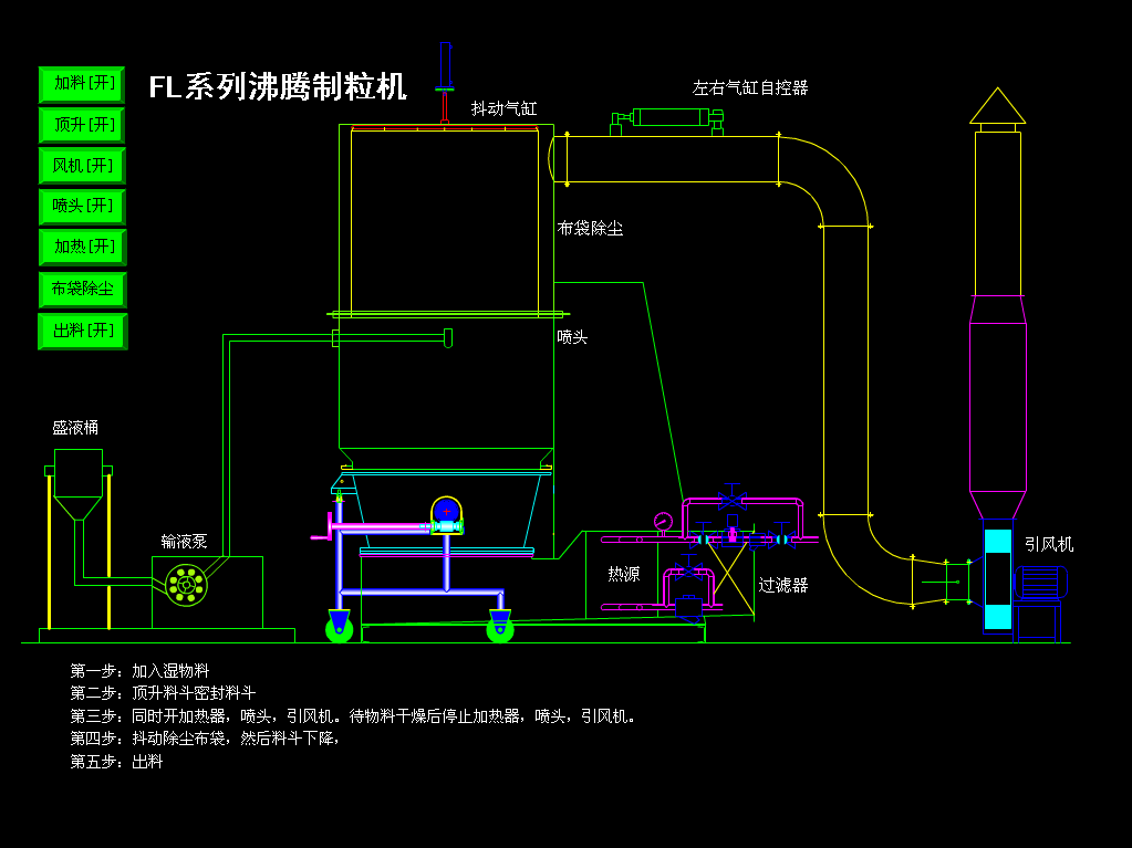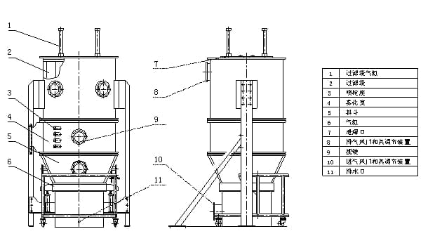 設(shè)備由流化床(原料容器)和噴霧干燥室、捕集室、頂升系統(tǒng)以及基座、霧化系統(tǒng)、加熱系統(tǒng)、空氣過濾系統(tǒng)和引風(fēng)系統(tǒng)組成。當(dāng)設(shè)備啟動后主機(jī)各容器自動密封,在引風(fēng)機(jī)的抽吸下,設(shè)備內(nèi)部形成一定量的負(fù)壓(可調(diào)),物料受負(fù)壓的作用,自流化床內(nèi)向上運(yùn)動至噴霧干燥室,由于噴霧干燥室的空間較流化床大,負(fù)壓下所產(chǎn)生的氣流在此部分流速變緩,從而物料自身重力克服了負(fù)壓氣流的推力后自然下落,當(dāng)下落至一定高度后負(fù)壓產(chǎn)生的氣流推力大于物料自重時物料又向干燥室方向運(yùn)動,以此往復(fù)形成流化狀態(tài)。通過對負(fù)壓氣流的調(diào)節(jié),使物料形成良好的流化態(tài),從而達(dá)到*佳的制粒干燥效果。